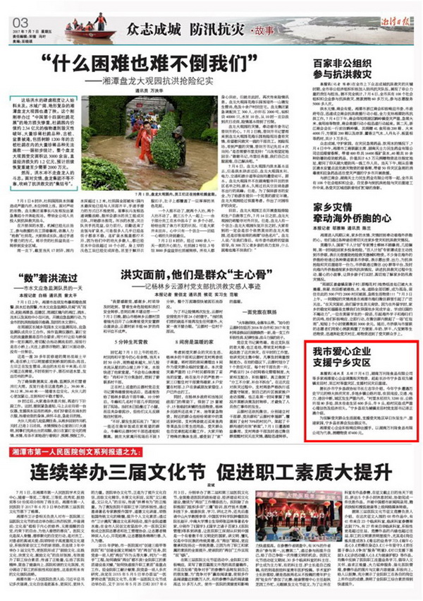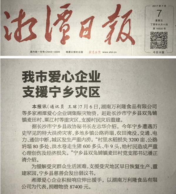 湘潭日報 2017年7月7日3版 刊登了湖南萬利隆食品有限公司支援寧鄉災區的報道